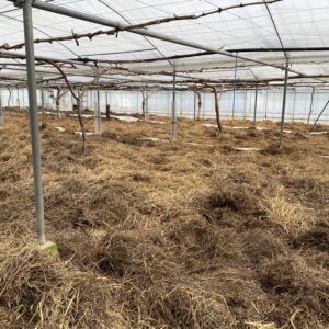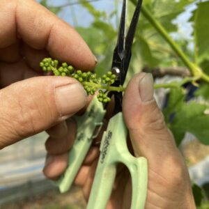 ゴールドフィンガーの甘味はキャンディの「黄金糖」や綿菓子を思わせるようで、酸味はほとんどありません。薄皮で食べやすく、噛むとパリッっと割れて甘い果汁が口内に広がります。脱粒しやすく割れやすい性質のため、当園では長らく栽培を休止していましたが、お客さまの声に応えて作付けを行いました。