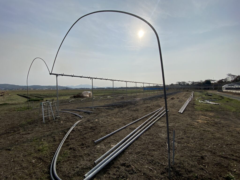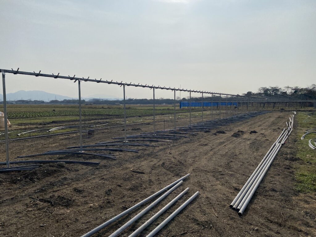 現在、当園では冬季剪定の傍ら、新園地にてビニールハウスの新設作業を行っています。